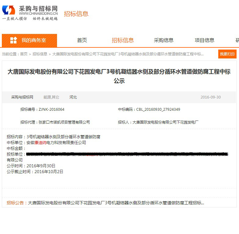 恭喜我公司在大唐國際發(fā)電股份有限公司下花園發(fā)電廠3號(hào)機(jī)凝結(jié)器水側(cè)及部分循環(huán)水管道做防腐工程招標(biāo)成功。