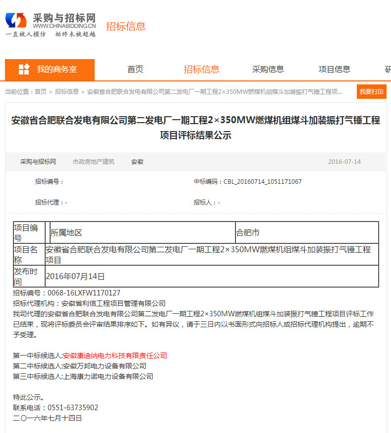 安徽省合肥聯合發電有限公司第二發電廠一期工程項目評標結果公示